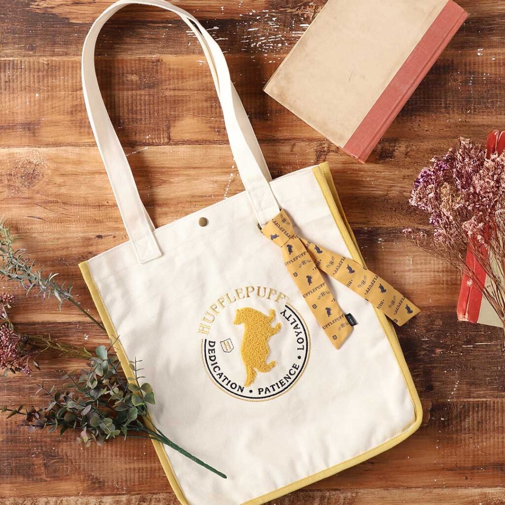 ホグワーツの4寮の象徴動物を、もこもこした立体的な触り心地がいいさがら刺繍で表現したトートバッグで、A4書類やノートパソコンもすっぽり入る、実用性とデザイン性を兼ね備えています。持ち手に付属したスカーフは寮のモチーフが入った総柄をデザインしてあり、スカーフの形はネクタイ型以外にも、リボン型にすることもでき気分に合わせて変えてお楽しみいただけます。通勤、通学から休日のお出かけまで、さまざまなシーンで活躍してくれる頼もしい存在です。