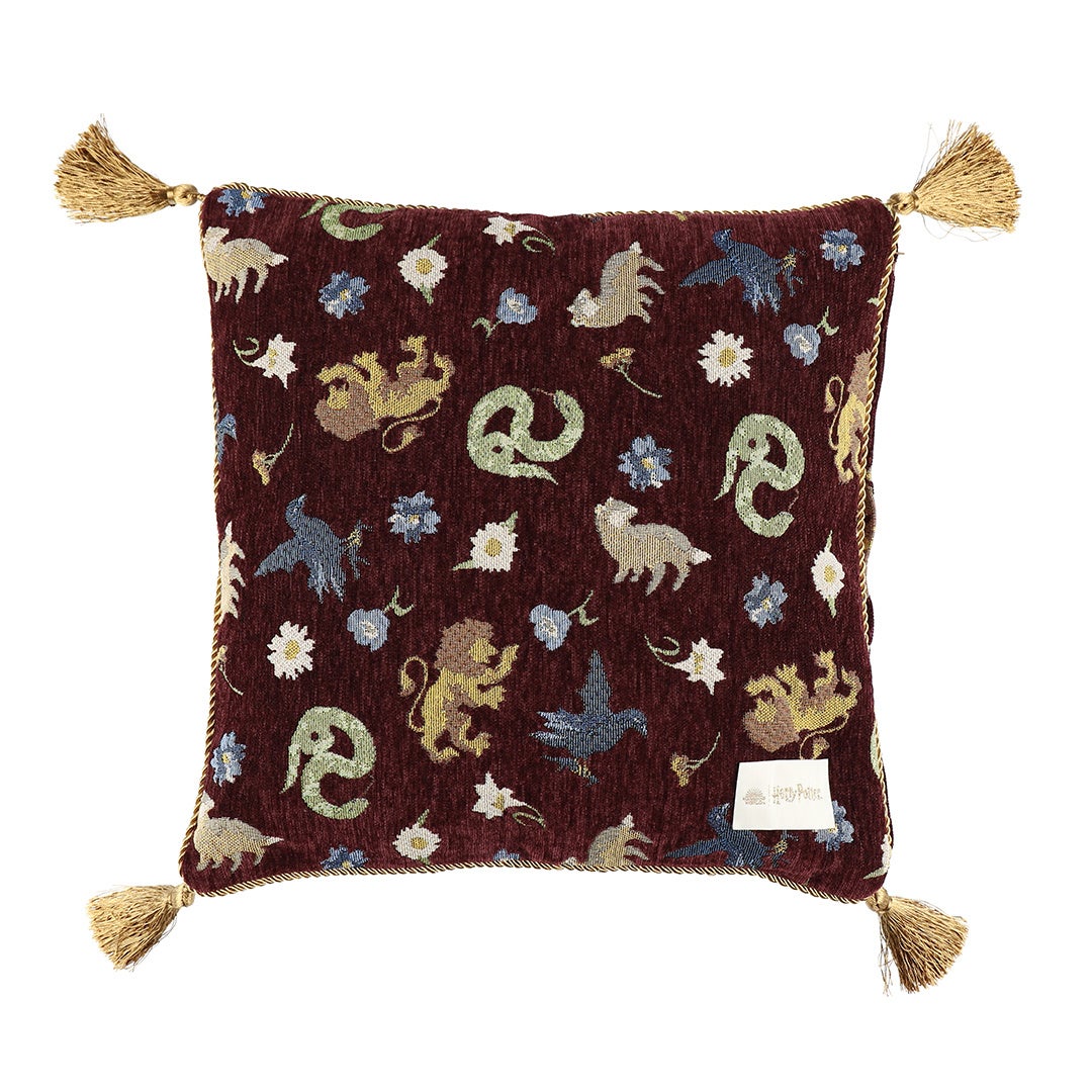 ホグワーツ4寮の象徴動物やホグワーツ城、お花などが散りばめられたシックなテキスタイルの枕と掛け布