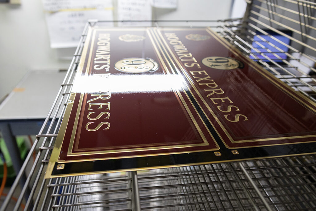 日本の工場で、手作業で一つ一つ丁寧に作り上げられる「9と3/4番線サインボード」。