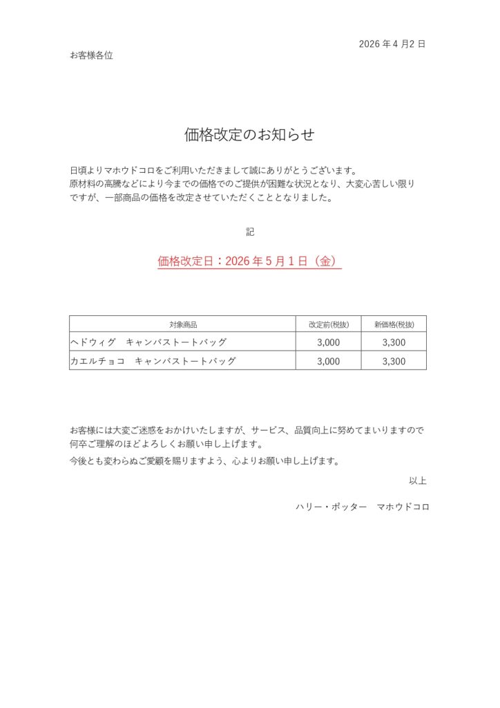 商品価格改定についてのご案内